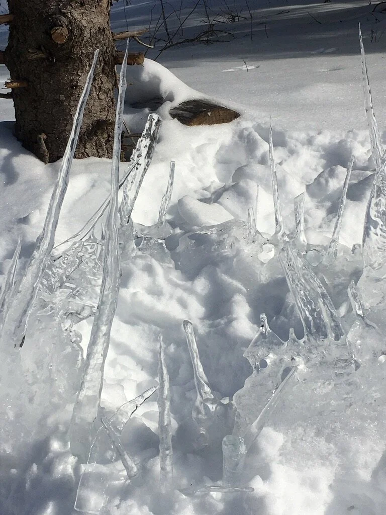 Our wonderful small group of children is really enjoying the snow and the few sunny days, we were blessed with. We start with sledding and digging holes into the mounts of snow at the parking lot and then a sled ride to feeding the animals, Little Feather (horse), Hot spot (dwarf horse) and Tumbelina (donkey) are very eager to get our apples, we saved for them from the fall. Whenever they see us they come to the gate and want to get their treats. Also the ducks are now eagerly eating the corn from our hands if we are still enough to let them come close. The hay barn smells lovely while we eat our snack and drink hot chocolate. Afterwards we discover Ice cycles hanging from a roof and harvest them and bring them carefully to be built into a castle.